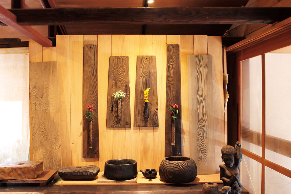 ![]() 黒柿杢茶碗 | ![]() 黒柿杢抹茶椀 | ![]() 欅焼黒漆花器 |